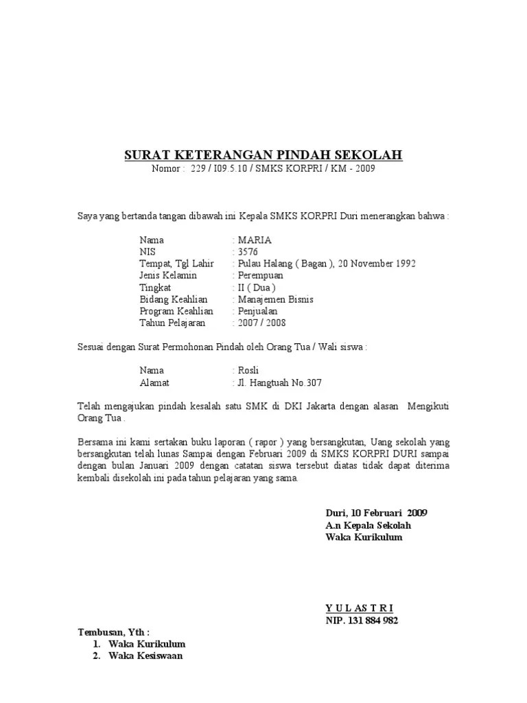 Contoh format surat keterangan pindah sekolah · pemerintah kabupaten (nama kabupaten). Sistemnya yakni orang tua/ wali siswa mengajukan permohonan pindah sekolah/ mutasi, kemudian pihak sekolah menunjukkan surat keterangan pindah sekolah/ mutasi . Selanjutnya, orang tua bersama anak . Dari sdn 005 anda akan dibuatkan surat permohonan pindah sekolah yang di tanda tangani oleh orang tua.